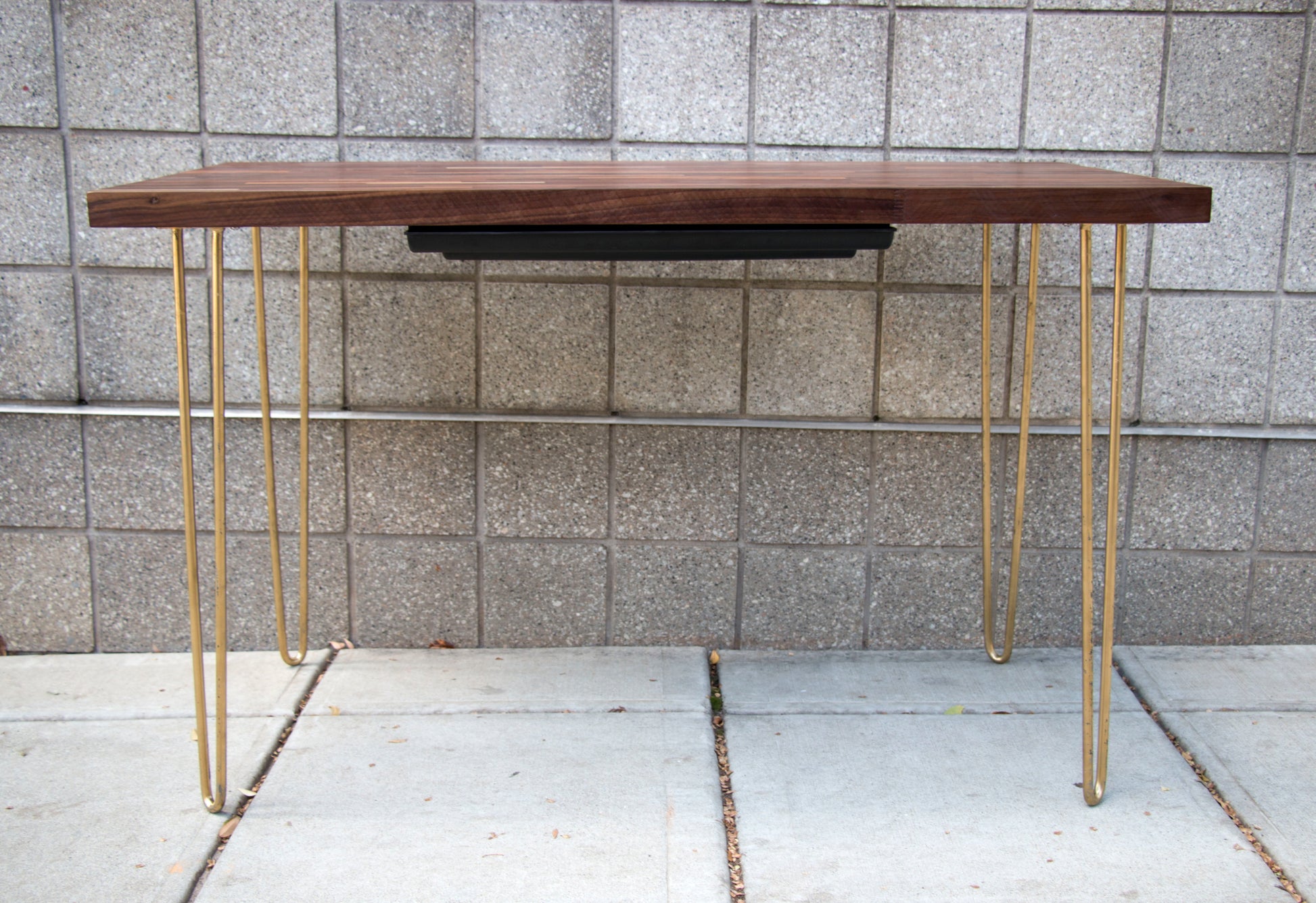 Now, you can virtually build a custom desk or bar to suit your needs! This standard height (29.5") desk with a custom desktop is available in any length up to 6 feet. Each top is made of solid wood that is 1.5" thick, and is available in Oak, Teak, Maple, or Walnut. Oak is offered in Ebony, Early American, Dark Walnut or a clear coat finish. Teak, Maple, or Walnut are offered in a clear coat finish. The steel hairpin legs are made in North Carolina.