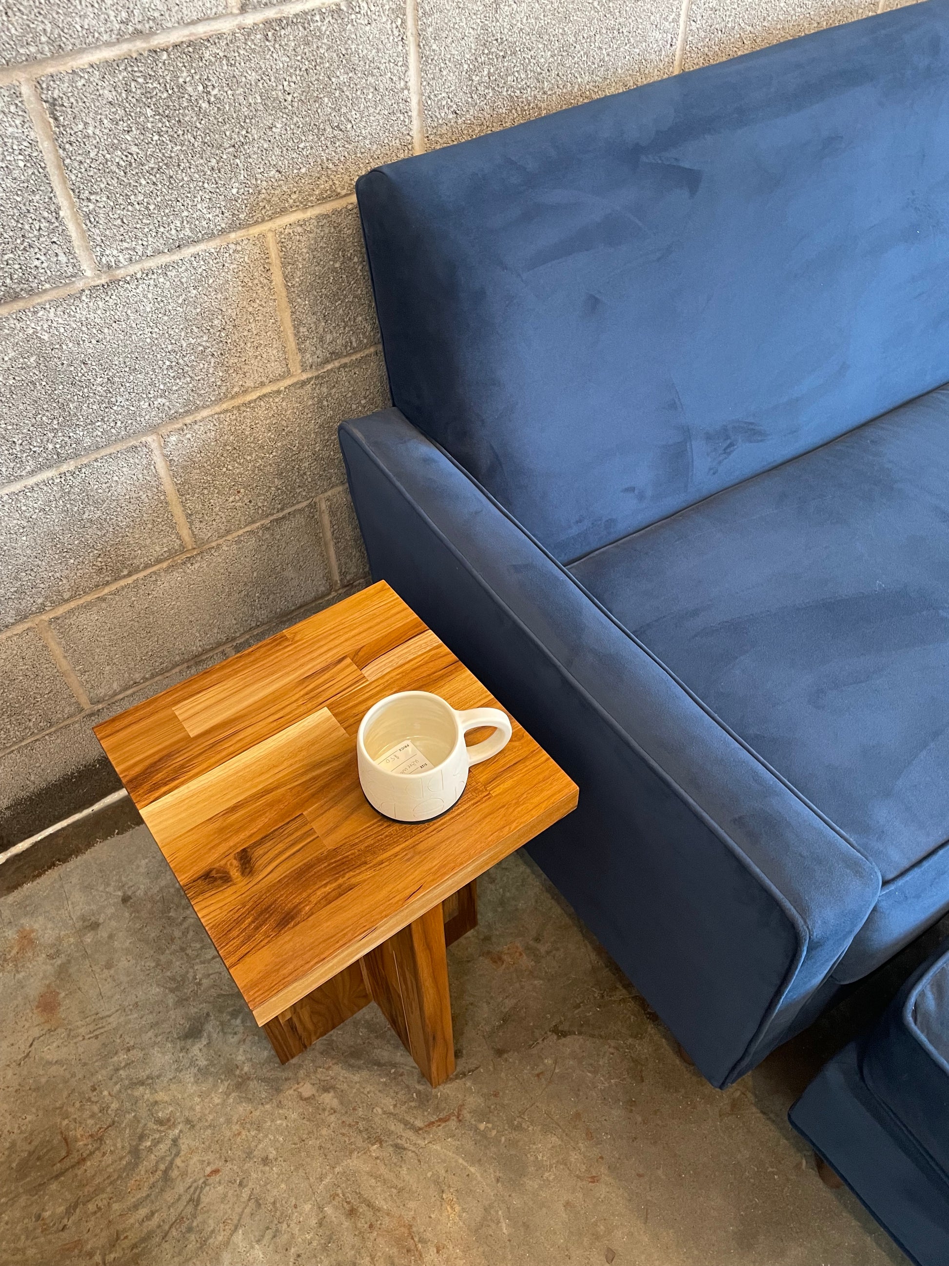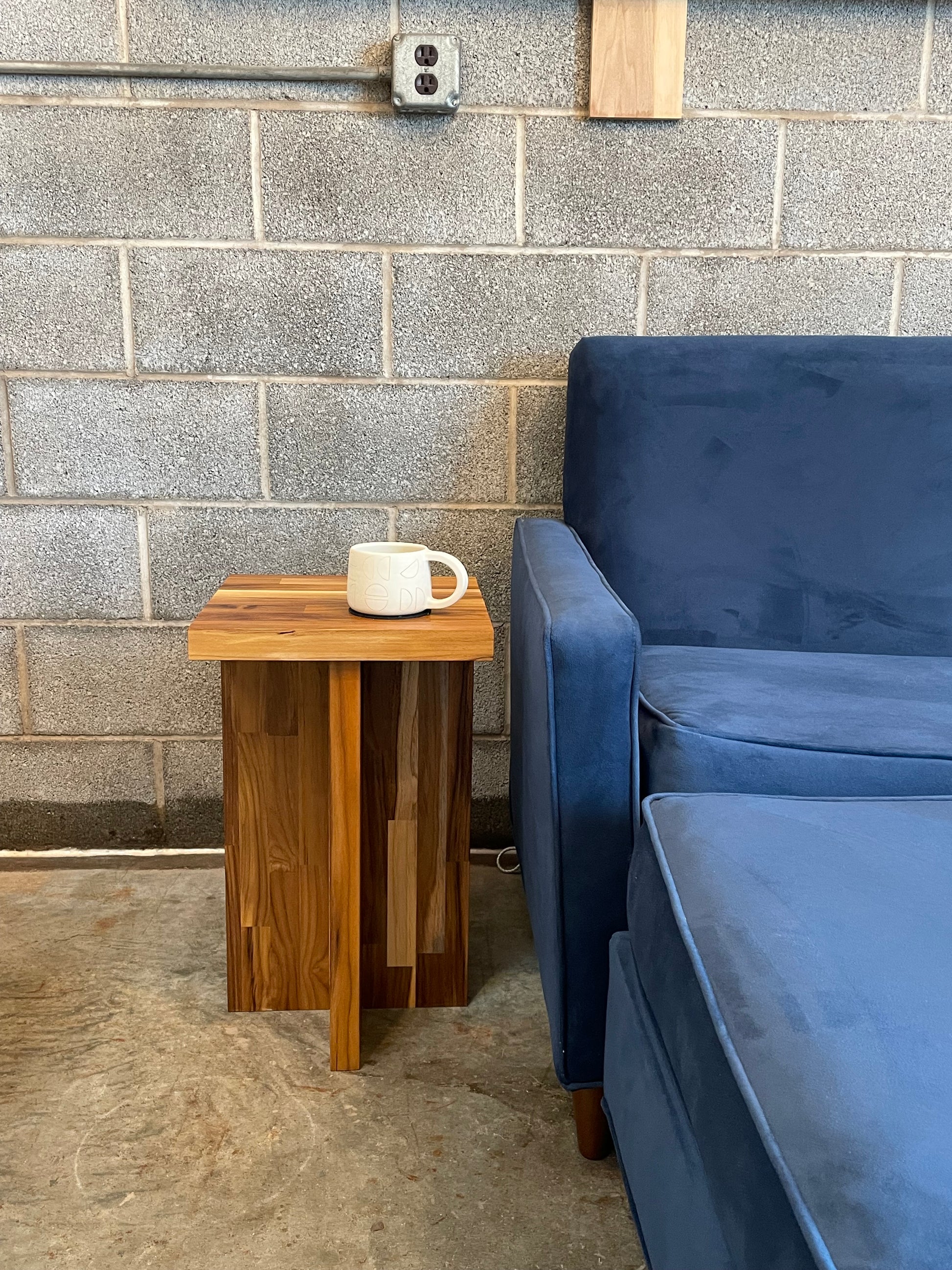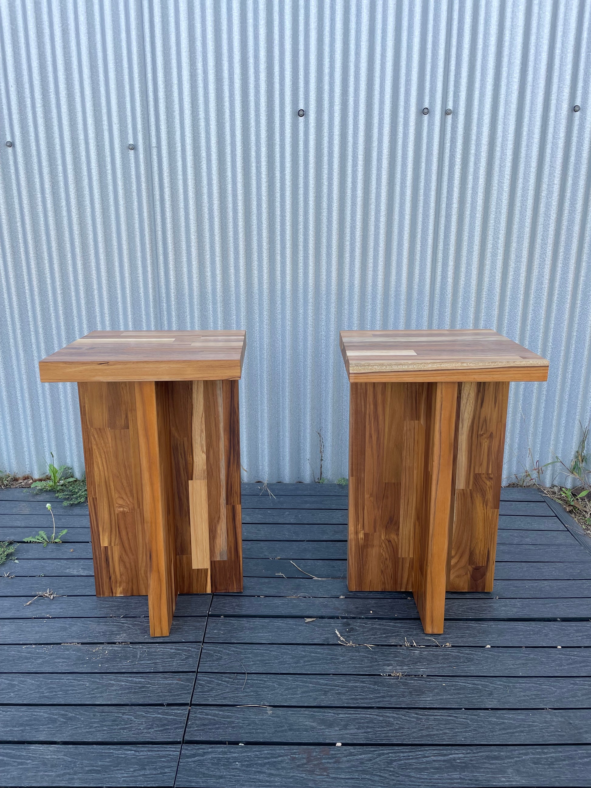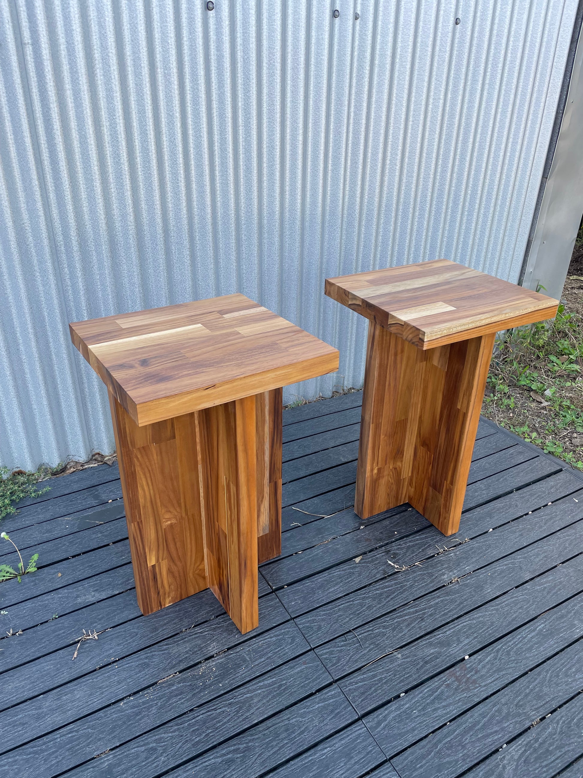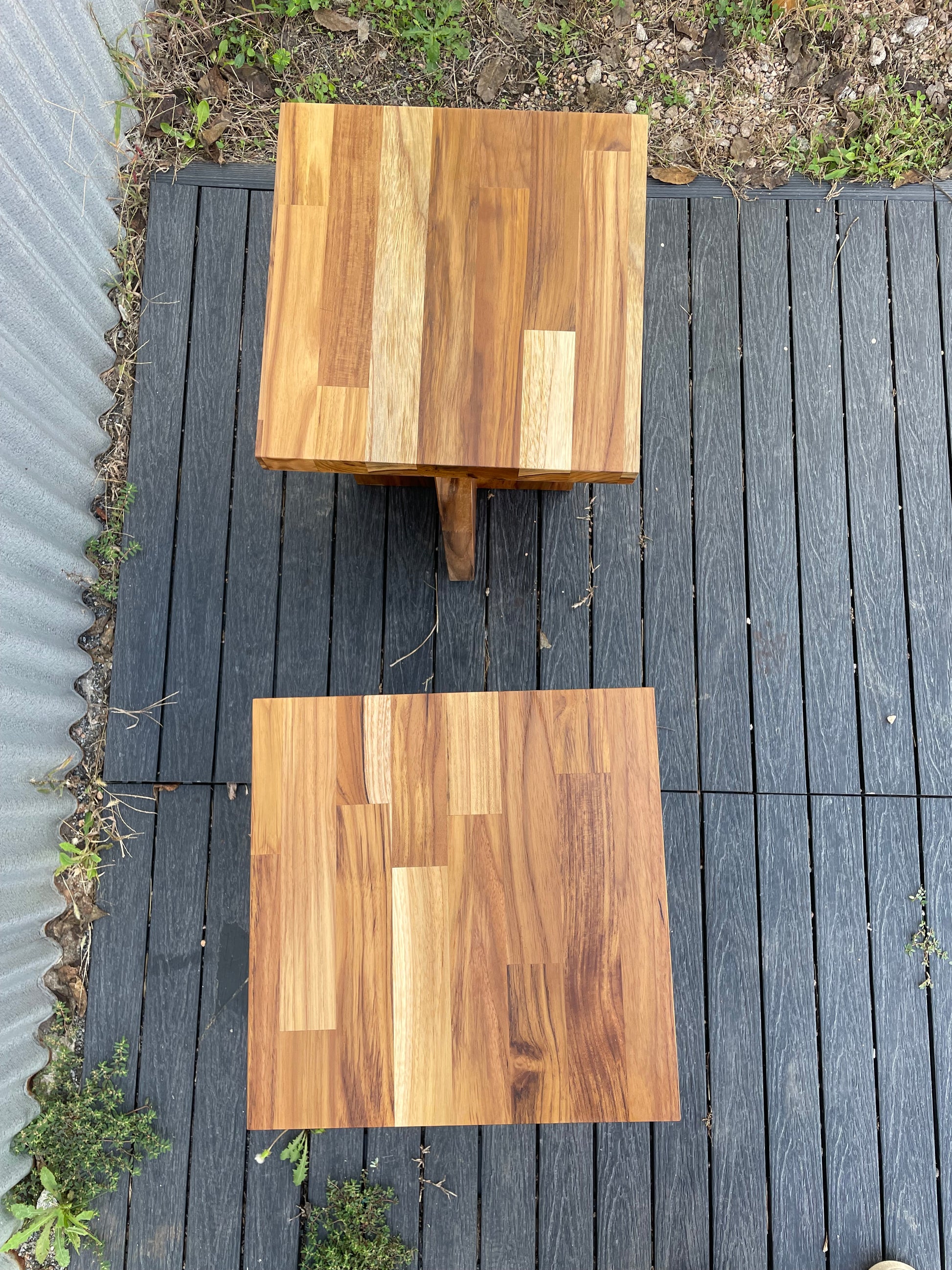 These teak side tables are handmade with solid butcher block wood and are an original design. Each table is sold individually but are great as a set! Each table measures 13.5 x 13.5 x 22 inches, but we are open to custom dimensions and different woods to best fit your space!