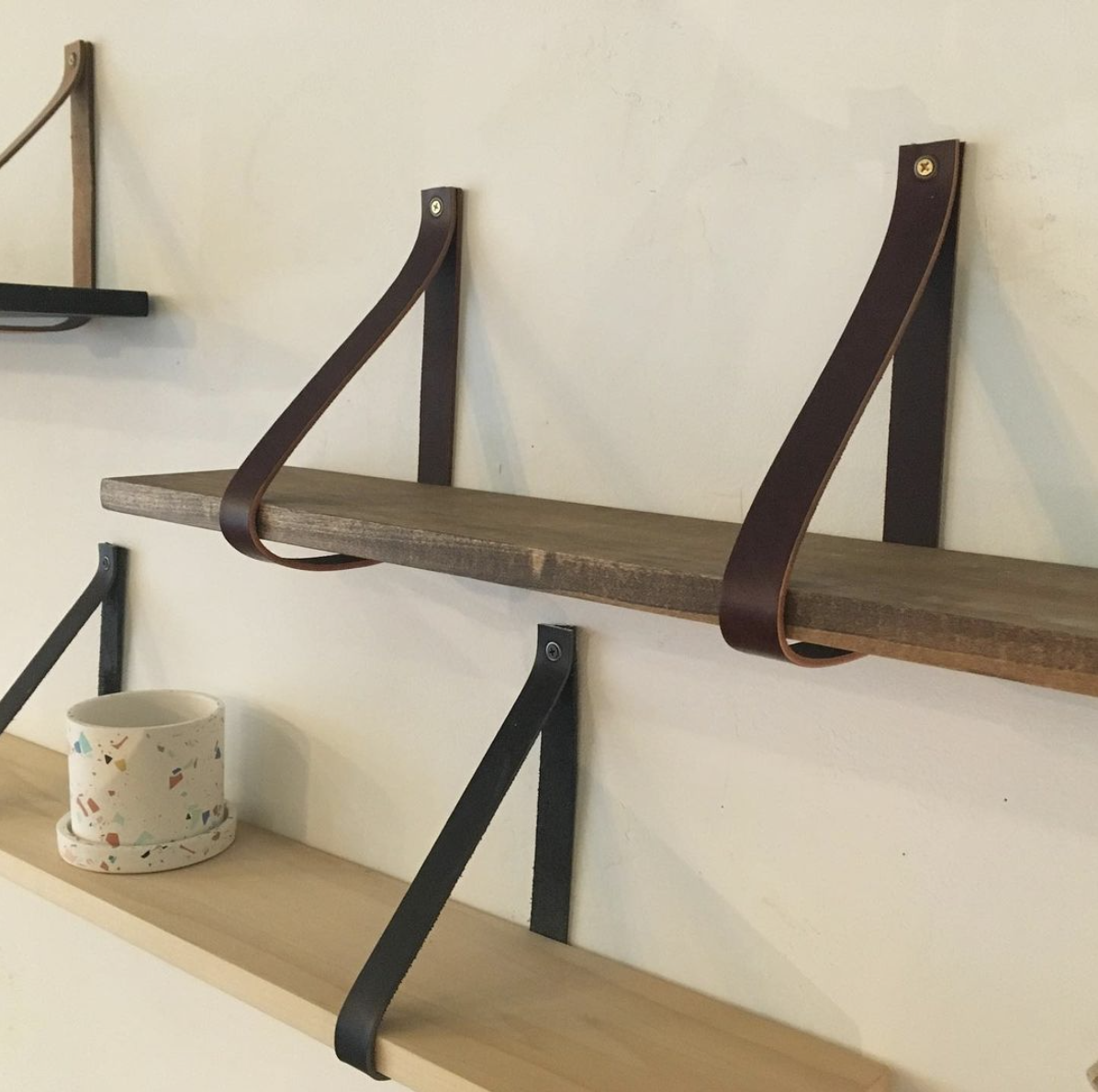 Have the perfect wood for an accent shelf already? This kit includes two leather straps that function as supports for your shelf, mounting instructions, and a set of hardware! Strap kits are available in natural vegetable tanned, brown, or black leather.